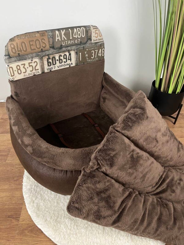 Autostoel voor hondje(s)/katje(s) veilig vast te maken. De maten zijn effectieve zitplaats (binnenafmetingen). Het haakje waar de hond aan vasthangt is verstelbaar in lengte. Ook het systeem om het mandje vast te maken met de gordel is aanwezig. Alles is demonteerbaar met ritsen om in de was te kunnen steken.